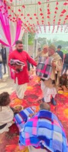 बिरनो थाना क्षेत्र के ग्राम सभा बिरनो के समाजसेवी अजीत सिंह उर्फ बुलेट बाबा के द्वारा अपने निर्माणधीन प्रतीक मैरिज लॉन बिरनो में हवन पूजन हरि कीर्तन पाठ के पूर्णाहुति पर समाजसेवी अजीत सिंह उर्फ बुलेट बाबा के द्वारा कंपकपाती ठंड को देखते हुए गरीबों में कंबल, साल गमछा का वितरण किया